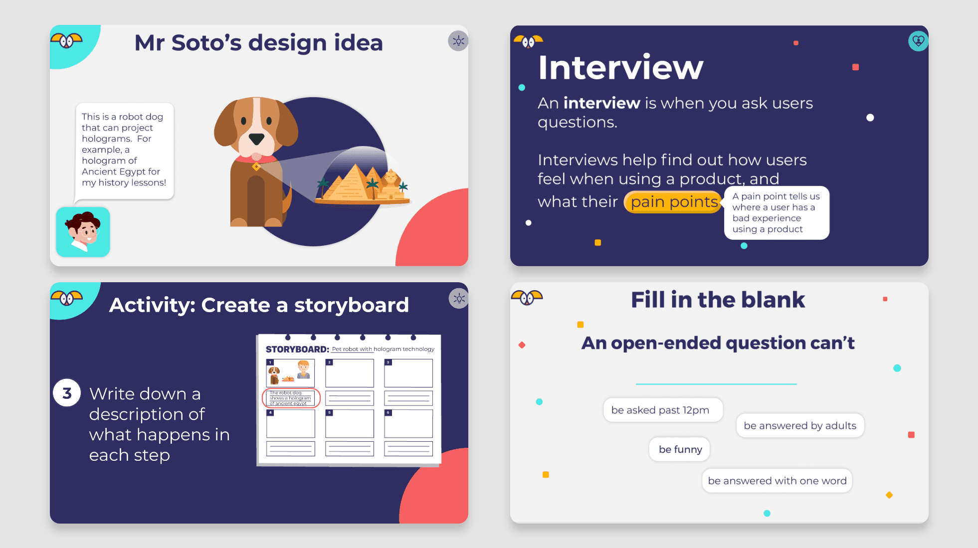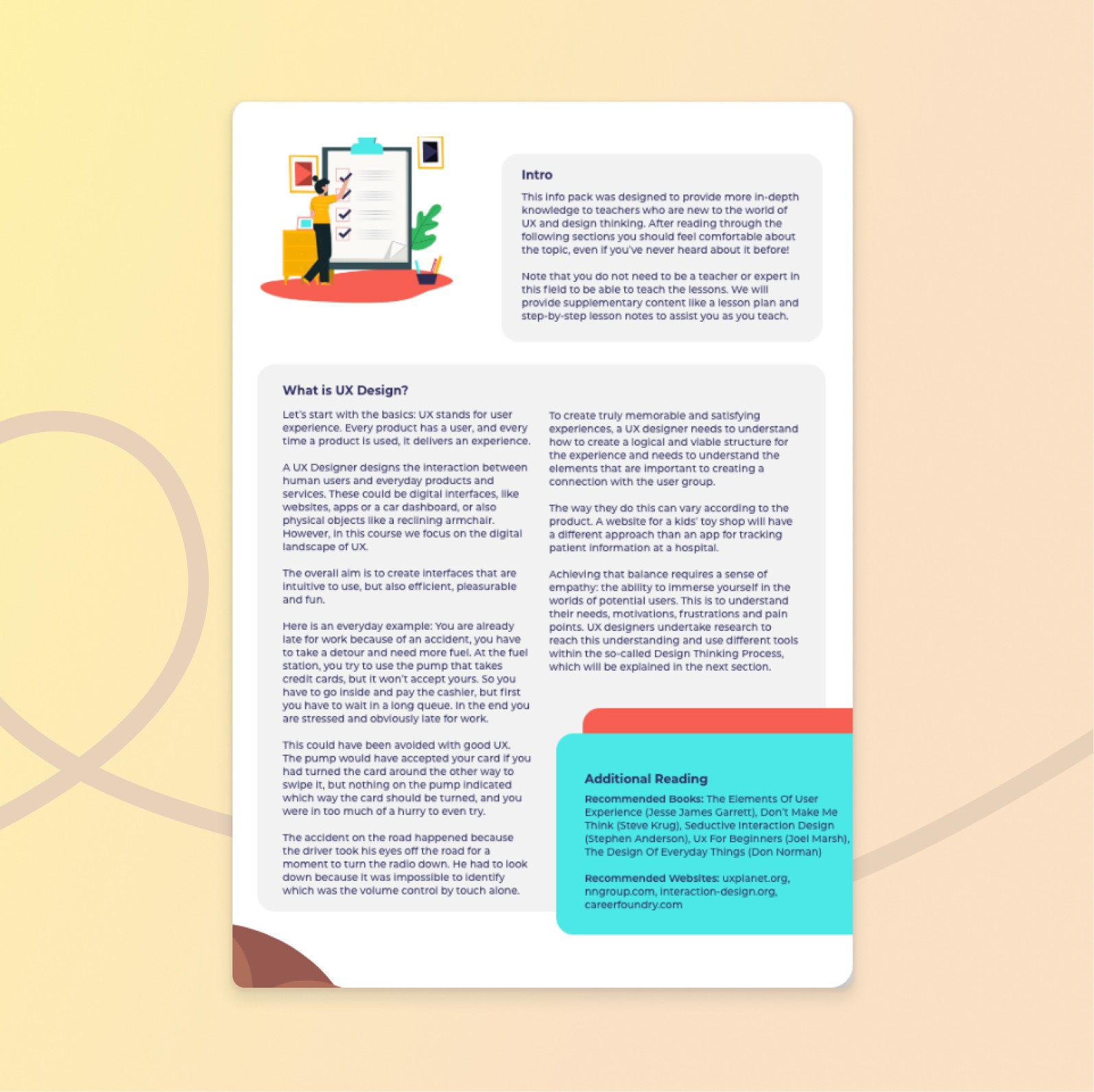 Working together as an international trio of UX Designer/Writers, we had a lot of fun crafting an engaging 12-week interactive course for kids aged 9-12 to learn about UX Design. Additionally, I contributed to business growth by creating teacher resources aligned with STEM and ISTE standards.