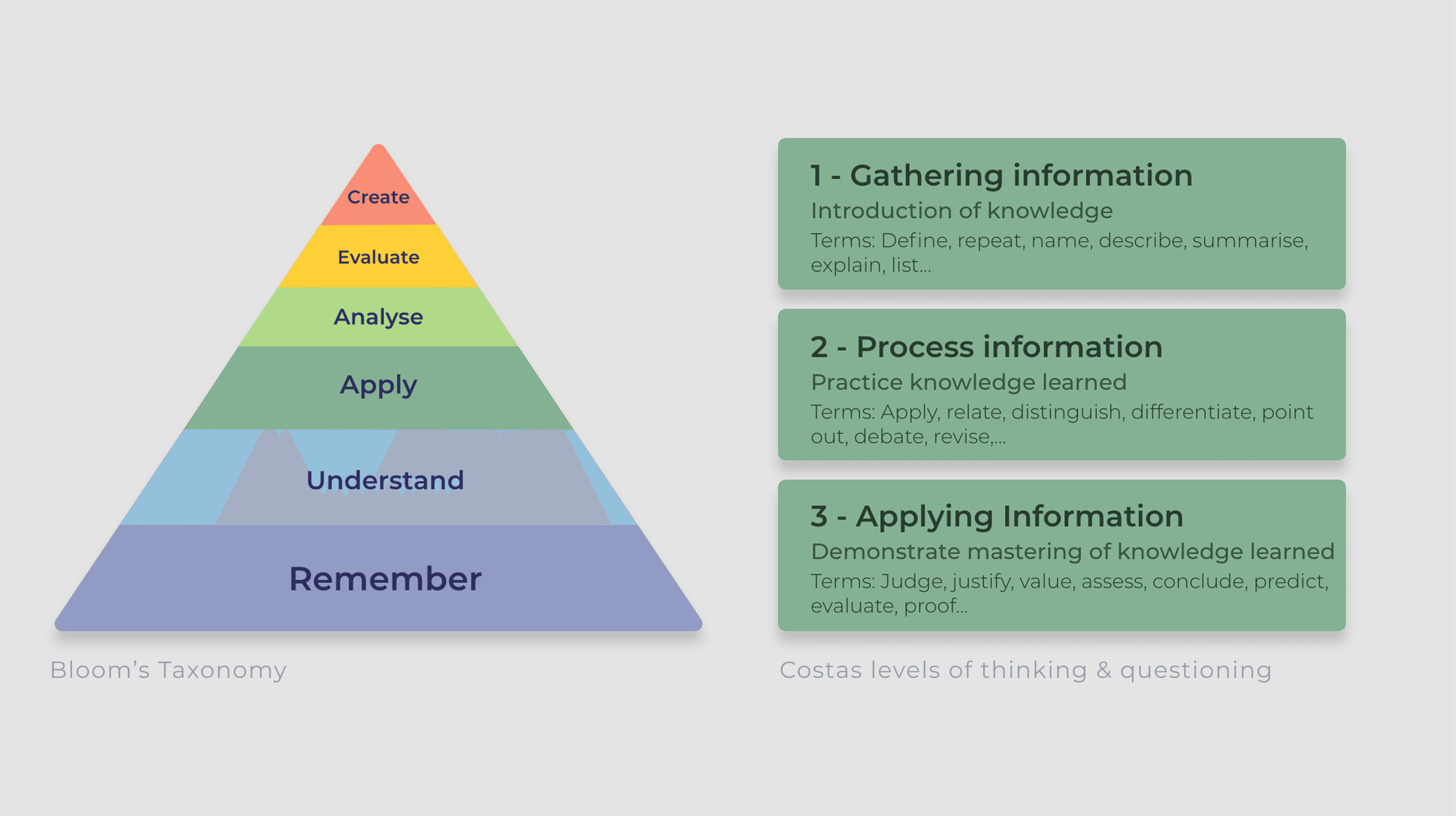 In addition to our own learnings and the testing feedback, I used the learning concepts of Maslow and Costa & Bloom as an influence to build out the course.