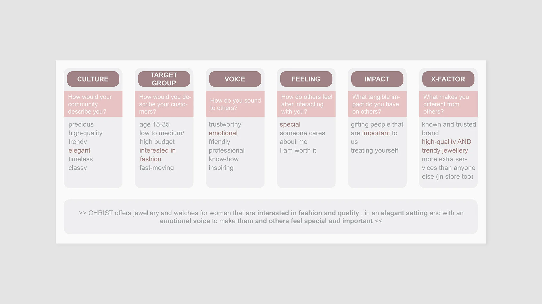 Afterwards we highlighted the key attributes and used those to formulate the brand mission in one sentence.
