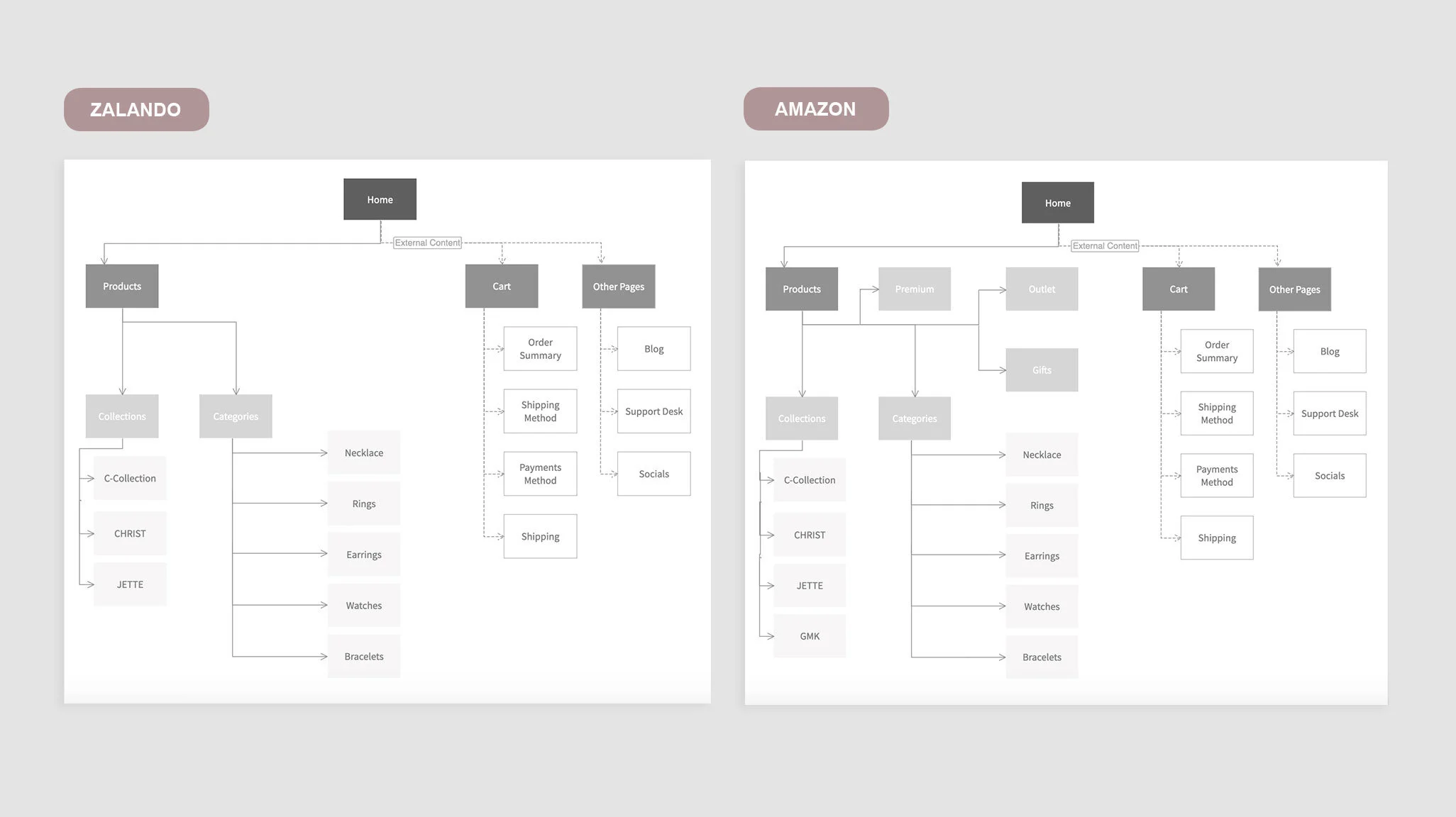 Brand shops are integrated in the actual platform shop and therefore just require navigation through product categories. There was no impact on filter methods and the information architecture for this project was rather limited. I visualised the chosen categories in a sitemap.