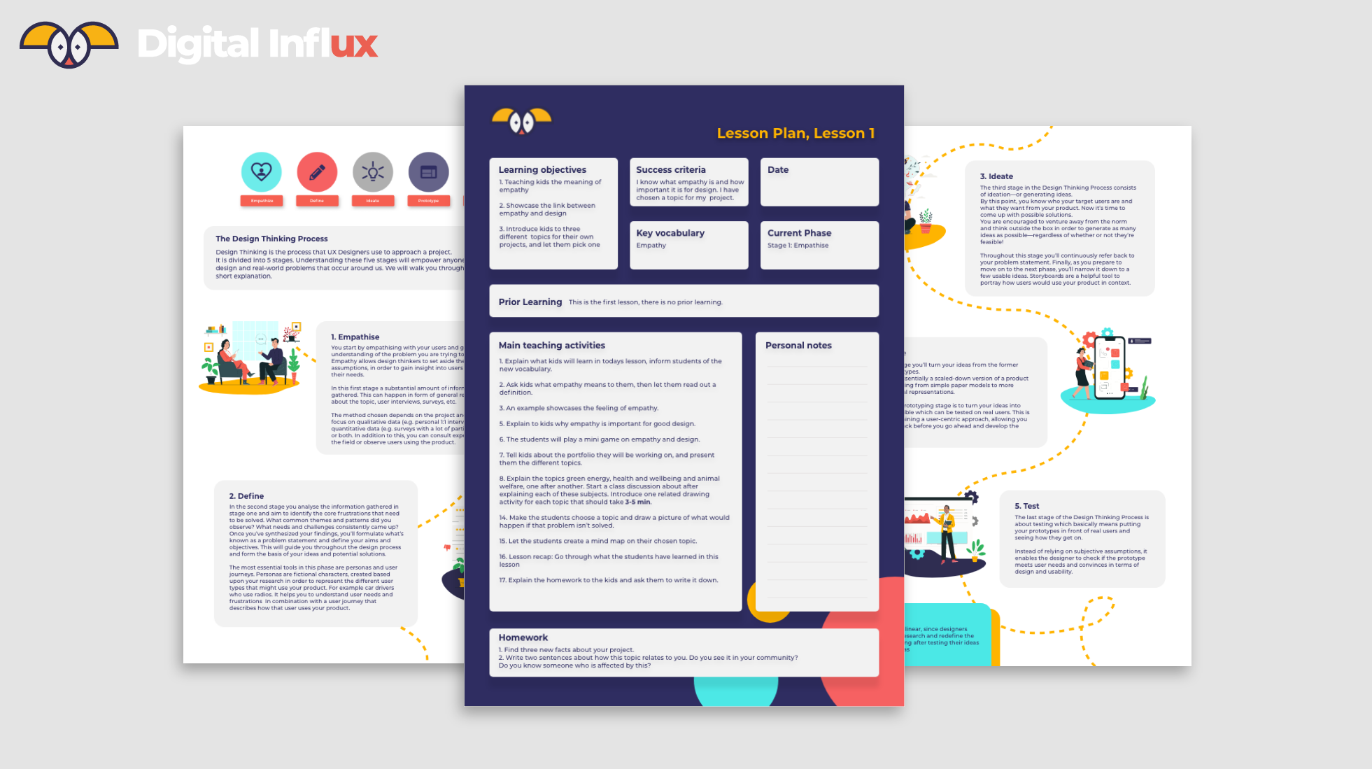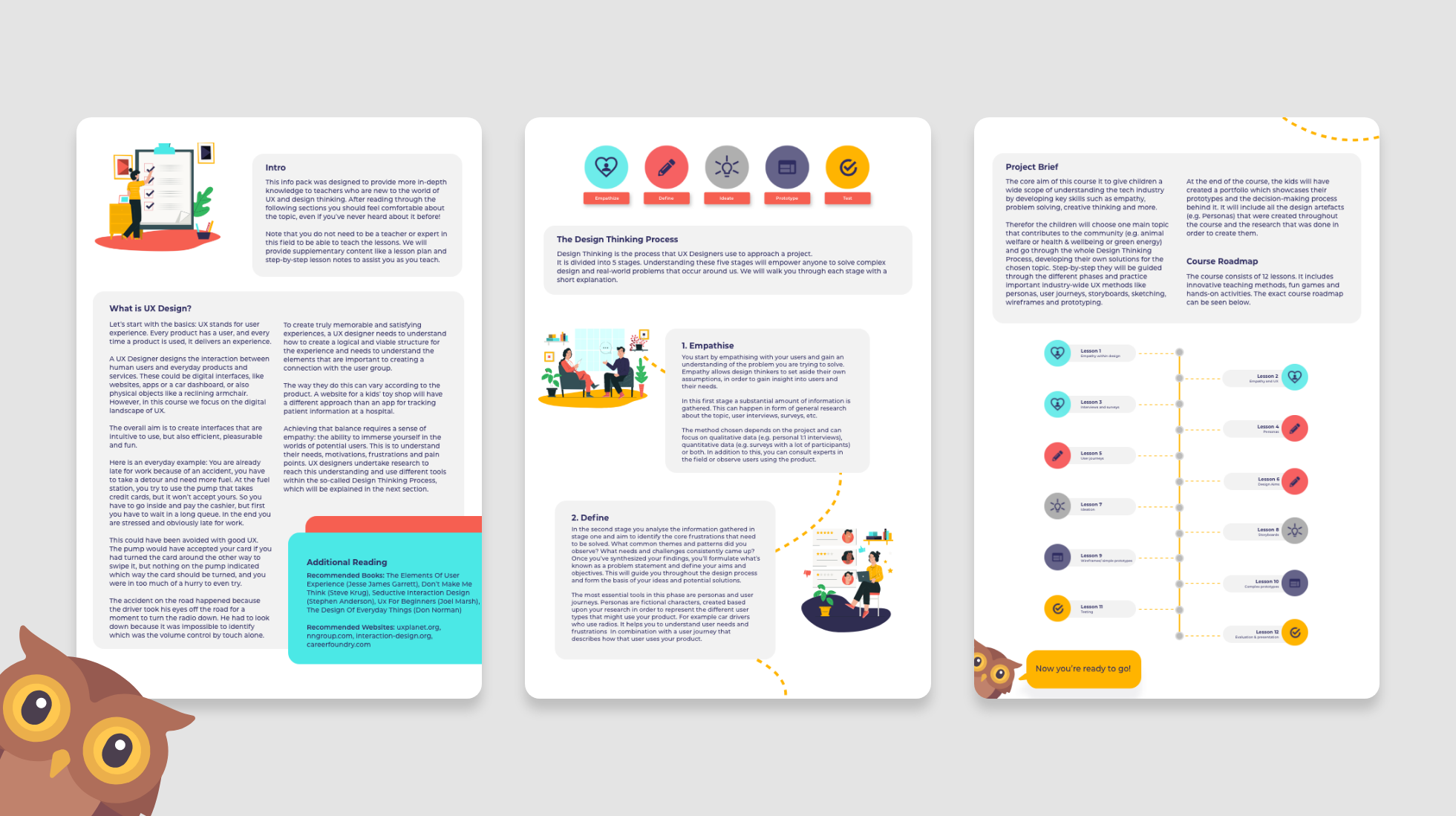 Firstly, I wrote and designed a teacher info pack. This info pack was put together to provide more in-depth knowledge to parents and teachers who are new to the world of UX and design thinking. After reading through it they should feel comfortable about the topic, understand what UX design is, what it is used for, the underlying process and get an overview of the course in form of a roadmap.