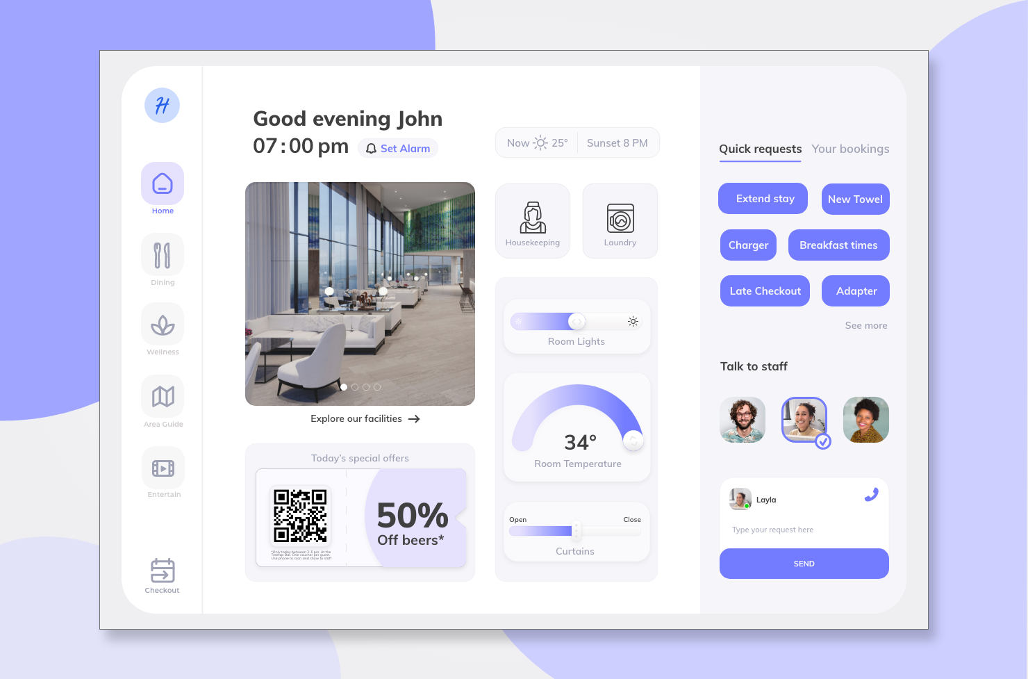 A second interface gives the hotel managers insights into KPI’s and control to adjust, content, marketing offers and colour scheme according to their business needs.