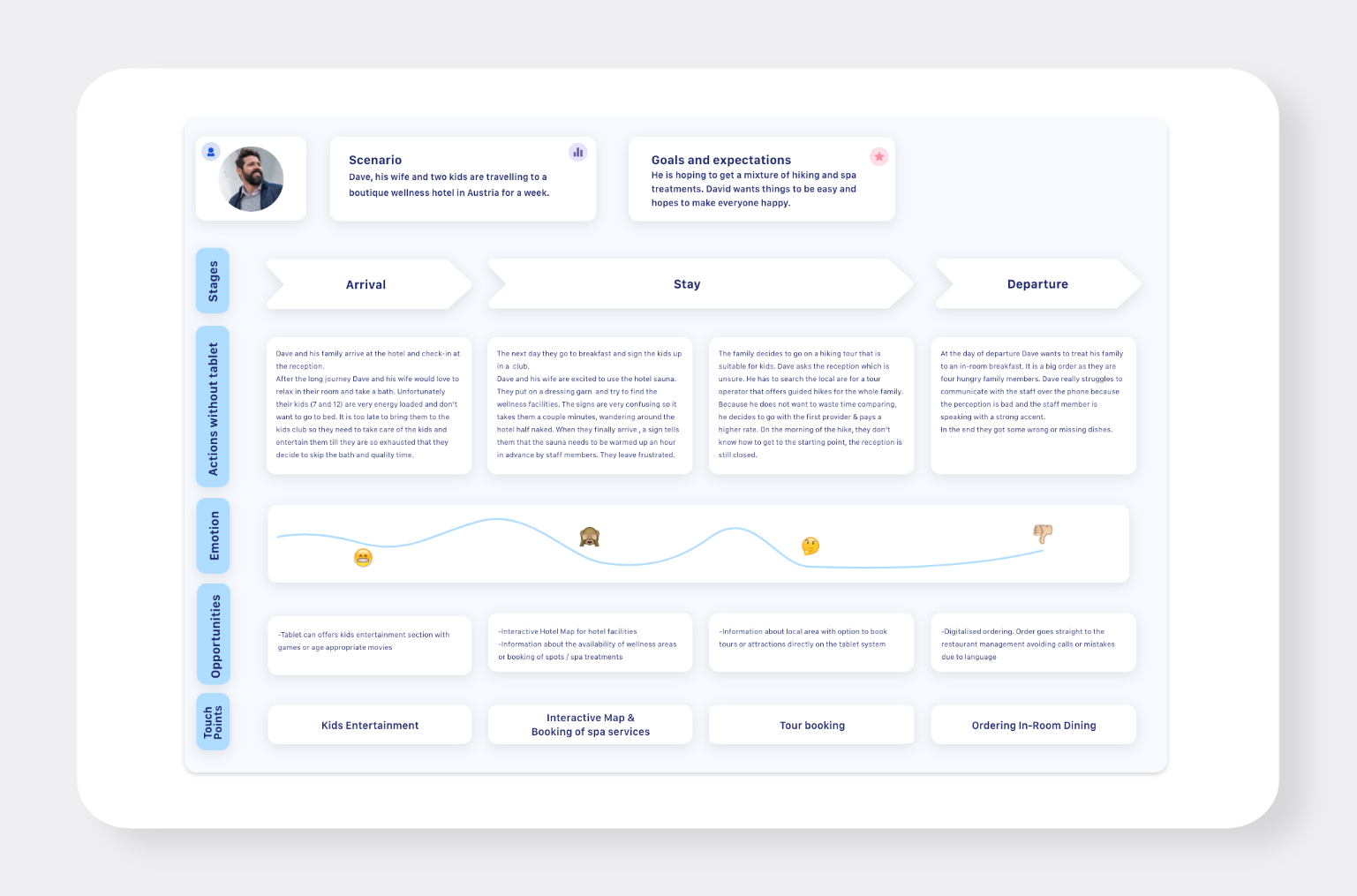 Empathy maps and user journeys for all Personas were created and split up into the 3 stages: pre-arrival, stay and post-departure. This was to identify further touchpoints and frustrations.